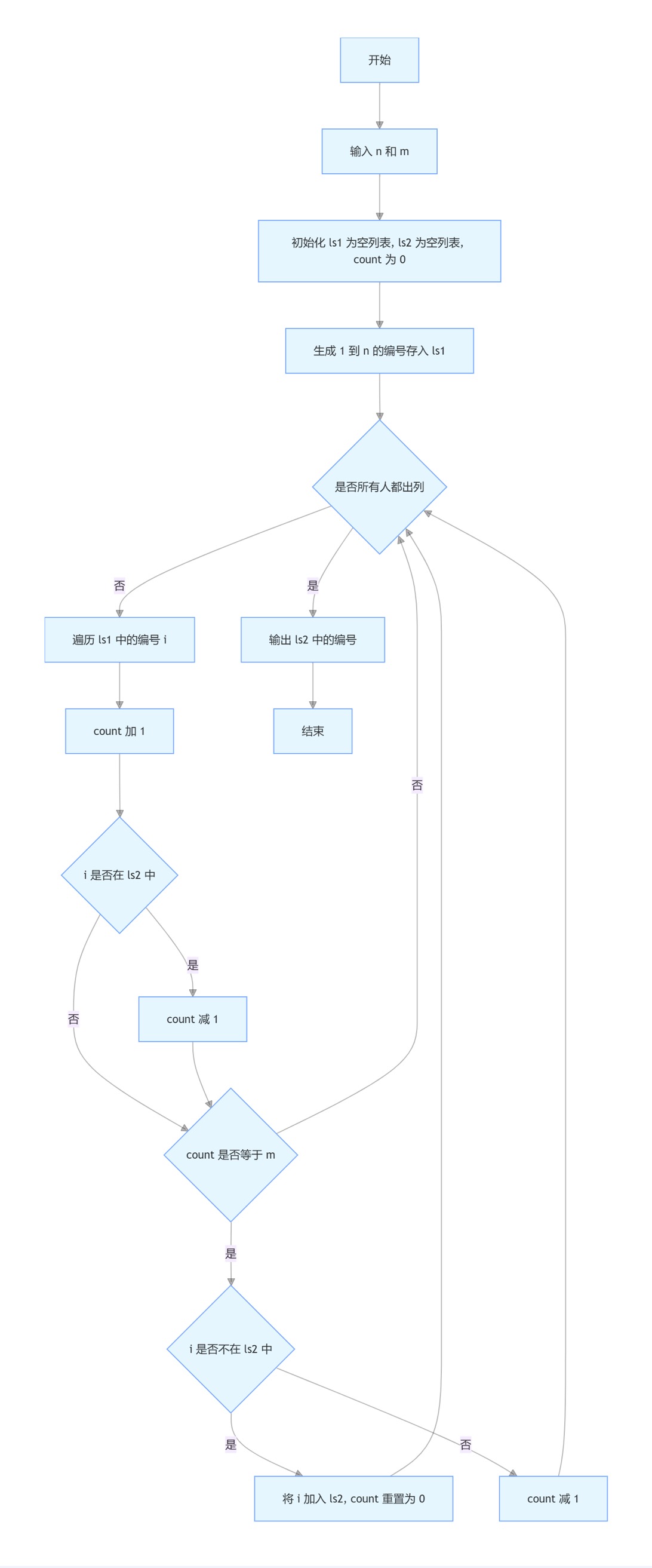 n,m=map(int,input().split()):通过用户输入获取两个整数n和m,n代表总人数,m代表每次数到第m个人出列。