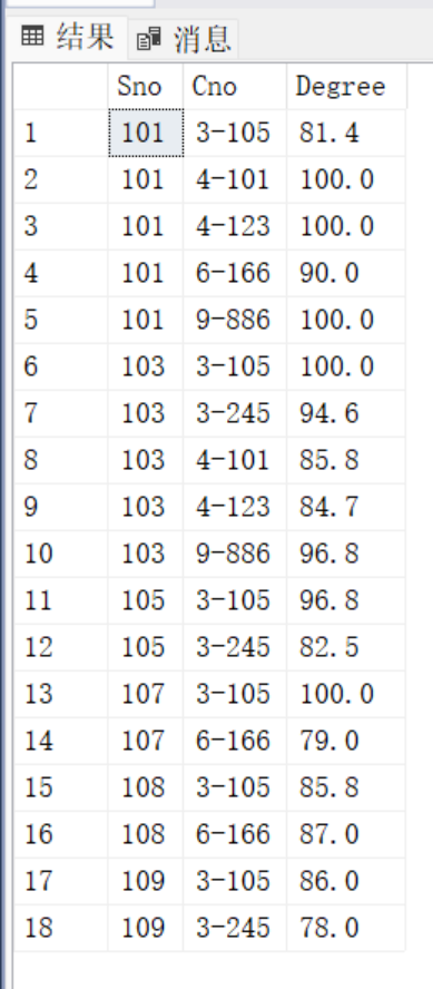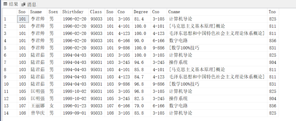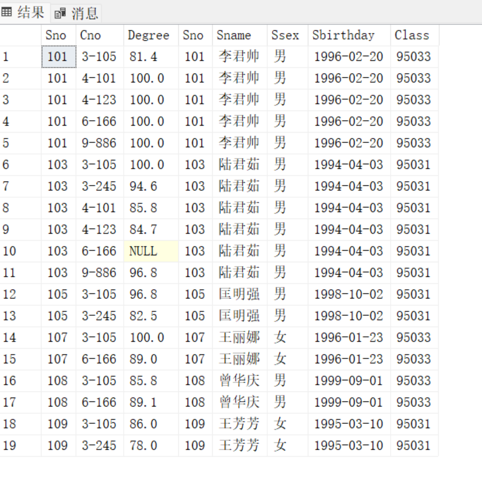 SELECT * FROM STUDENTA039 S JOIN SCOREA039 SC ON S.SNO=SC.SNO JOIN Course039 C ON SC.CNO=C.CNO