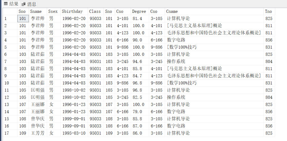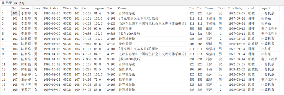 SELECT * FROM STUDENTA039 S JOIN SCOREA039 SC ON S.SNO=SC.SNO JOIN Course039 C ON SC.CNO=C.CNO JOIN TEACHER039 T ON C.TNO=T.TNO