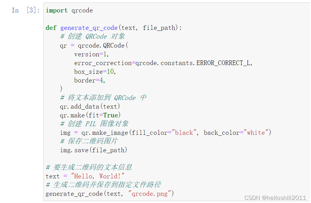 通过文本信息想创建一个二维码,文本信息定义为:“Hello, World!”,生成的二维码保存在同目录下,并命名为“qrcode.png”。