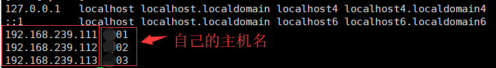 第四步:主机名与ip建立映射关系 vi /etc/hosts (有几台虚拟机,就添加几条映射)