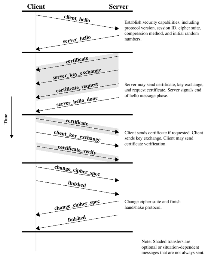 这种情况,除非服务器在阶段II明确请求,否则没有证书信息。客户端密钥交换方法包括阶段II收到的由RSA公钥加密的预备主密钥。