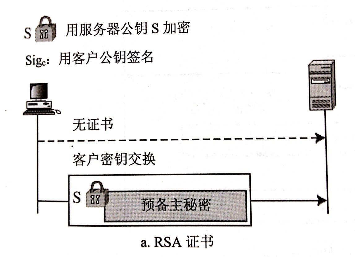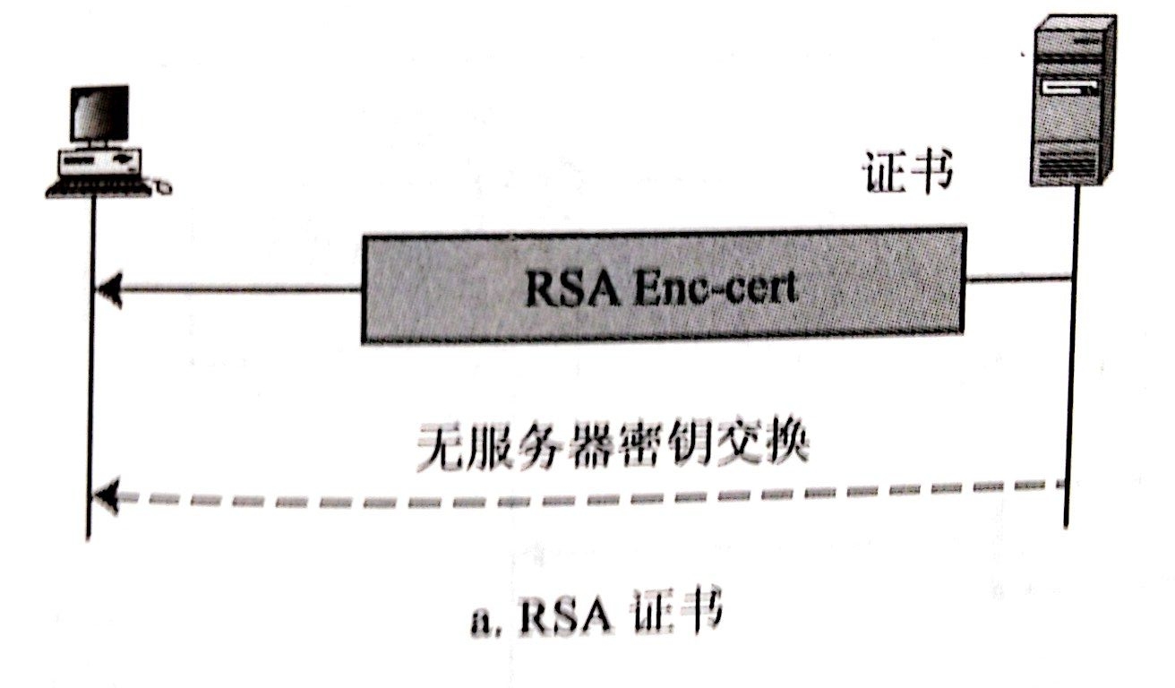 这个方法中,服务器在它的第一个信息中,发送了RSA加密/解密公钥证书。不过,因为预备主秘密是由客户端在下一个阶段生成并发送的,所以第二个信息是空的。注意,公钥证书会进行从服务器到客户端的验证。当服务器收到预备主秘密时,它使用私钥进行解密。服务端拥有私钥是一个证据,可以证明服务器是一个它在第一个信息发送的公钥证书中要求的实体。