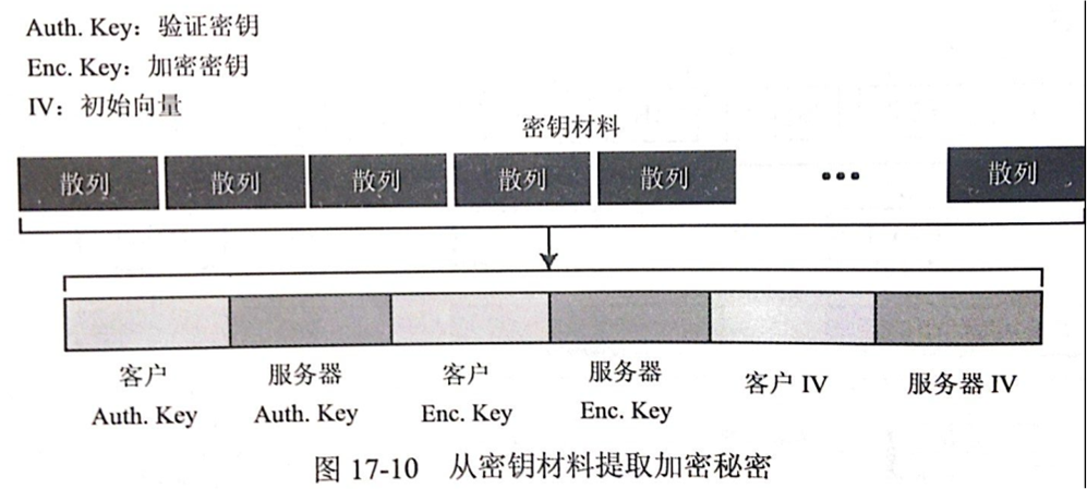 这样握手协议完成,下面看下什么是预备主密钥,主密钥是怎么生成的。为了保证信息的完整性和机密性,SSL需要有六个加密秘密:四个密钥和两个IV。为了信息的可信性,客户端需要一个密钥(HMAC),为了加密要有一个密钥,为了分组加密要一个IV,服务也是如此。SSL需要的密钥是单向的,不同于那些在其他方向的密钥。如果在一个方向上有攻击,这种攻击在其他方向是没影响的。生成过程如下: