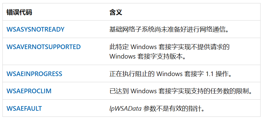 如果成功, WSAStartup 函数返回零。 否则,它将返回下面列出的错误代码之一。