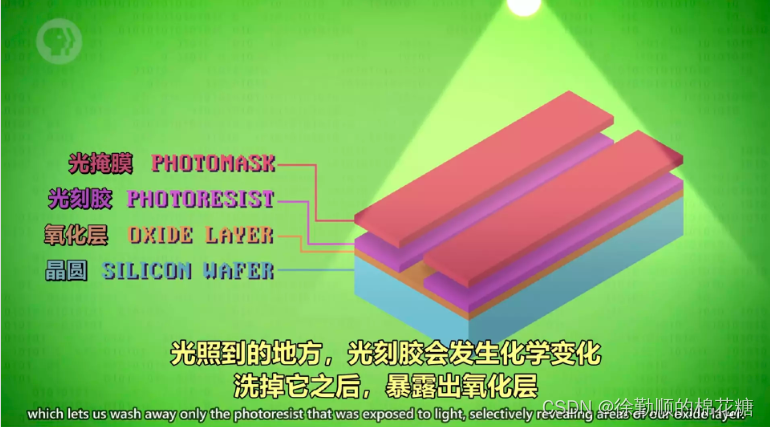 即用光把复杂图案印到材料上。我们把一片薄片状的硅叫做晶圆,通过一系列生产步骤,将晶圆表面薄膜的特定部分除去的工艺叫做光刻。