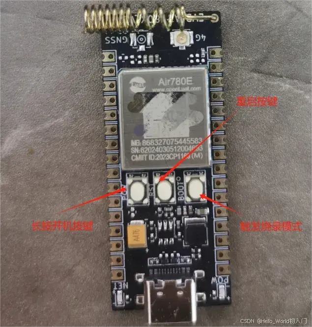 当我们模块没开机时,按着 BOOT 键然后长按 PWR 开机,进入下载。