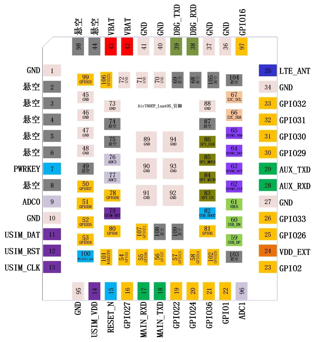 Air780EP模组用作LuatOS开发时的管脚图: