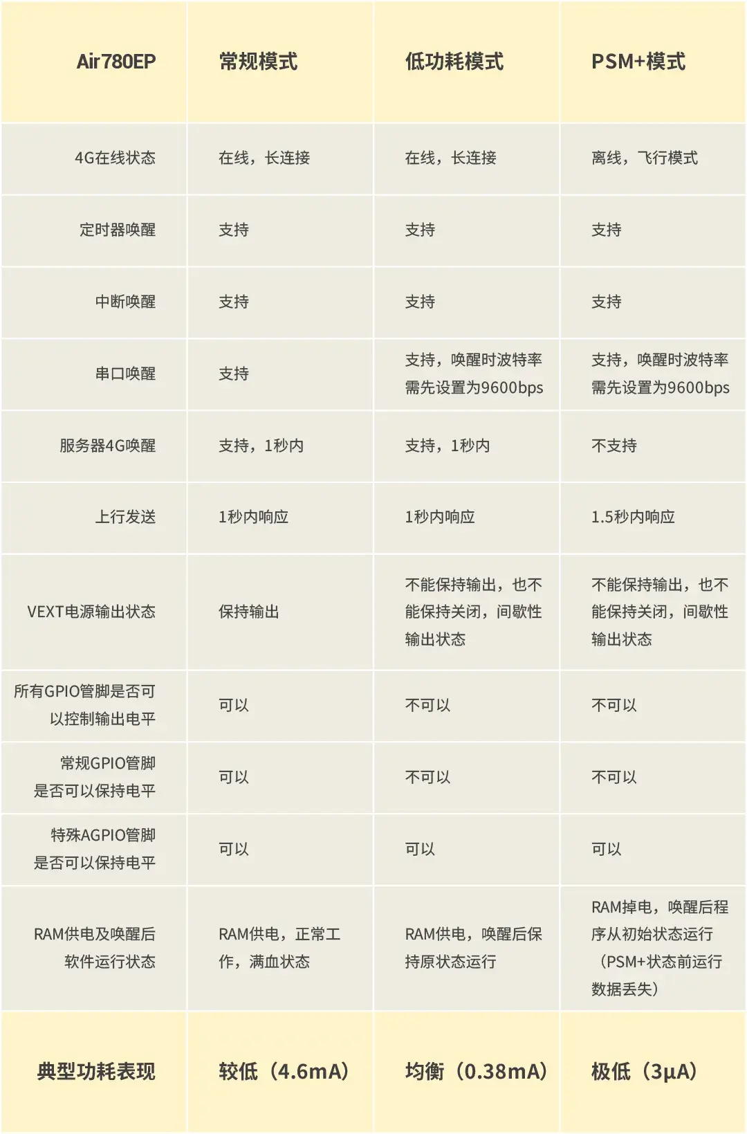 Air780EP功耗表现在现有模组中排名中等,低功耗模式下低于0.5mA,低功耗表现最好的模组型号是Air780EPS;