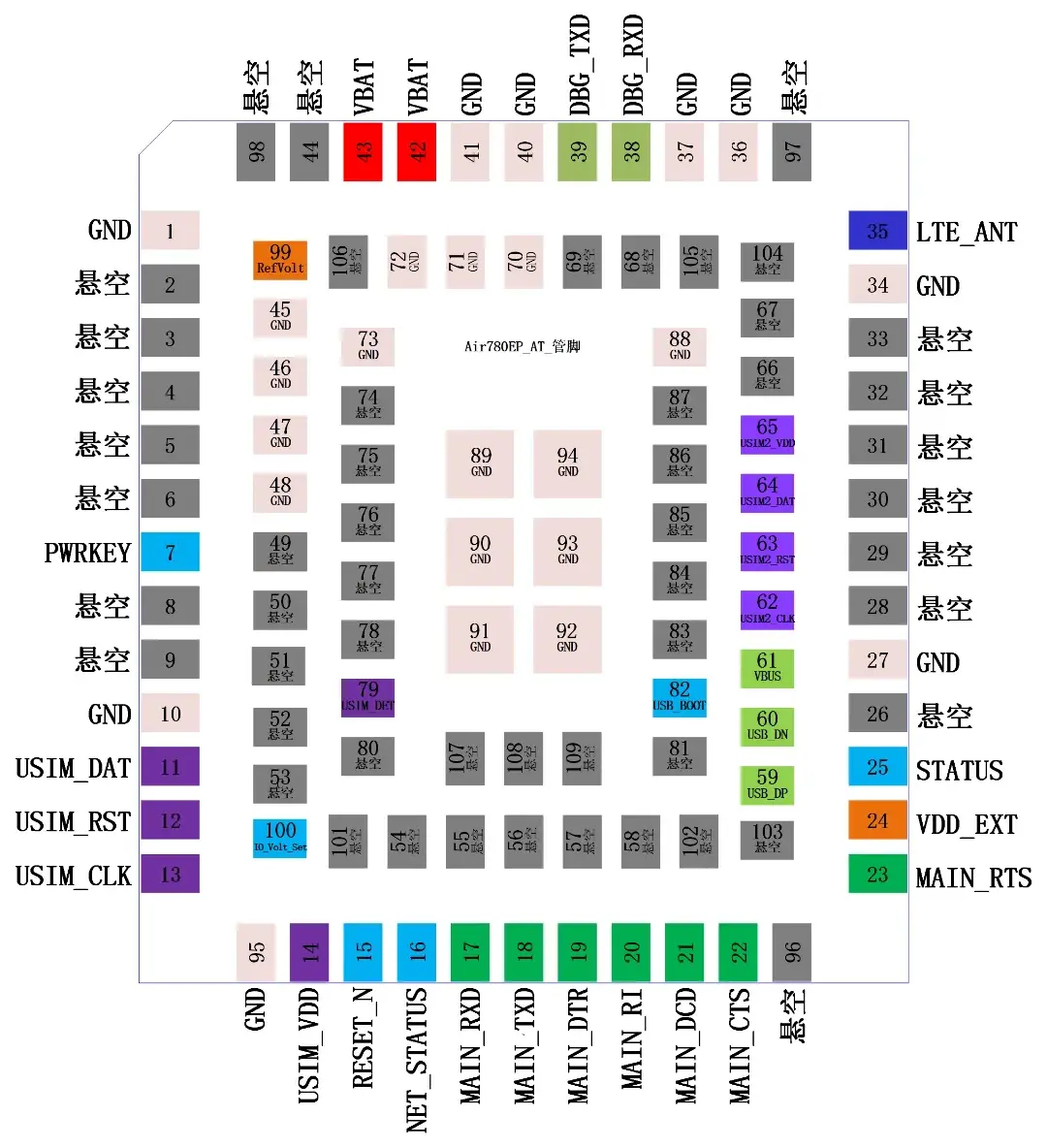Air780EP模组用作AT开发时的管脚图: