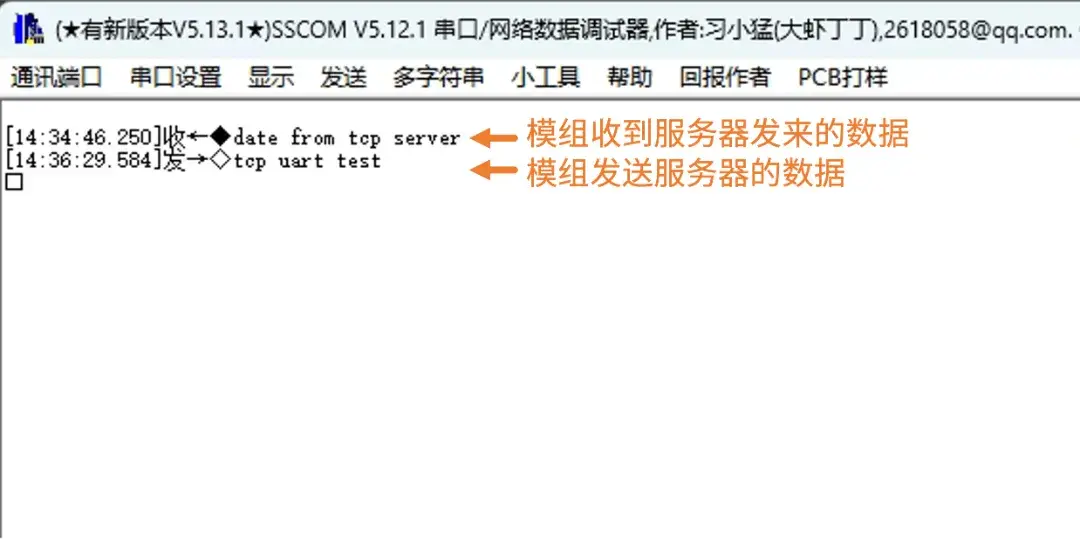 TCP服务器网页端向Air201模组发送:data from TCP server,Air201模组可以收到数据并且通过串口输出显示。