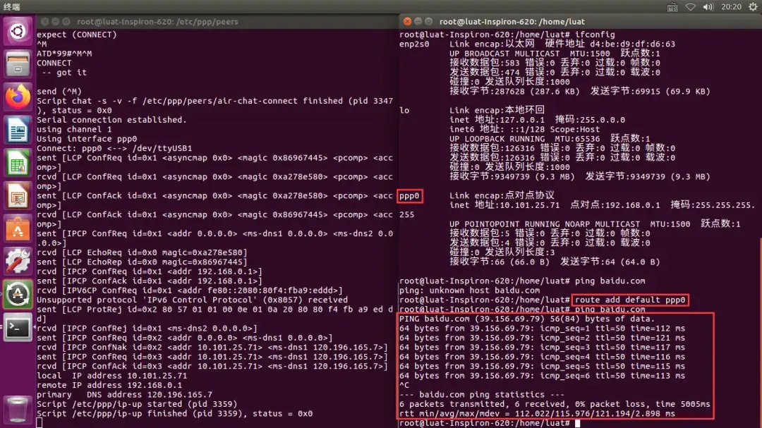 拨号成功后,需要为新建的ppp0网卡配置route。
