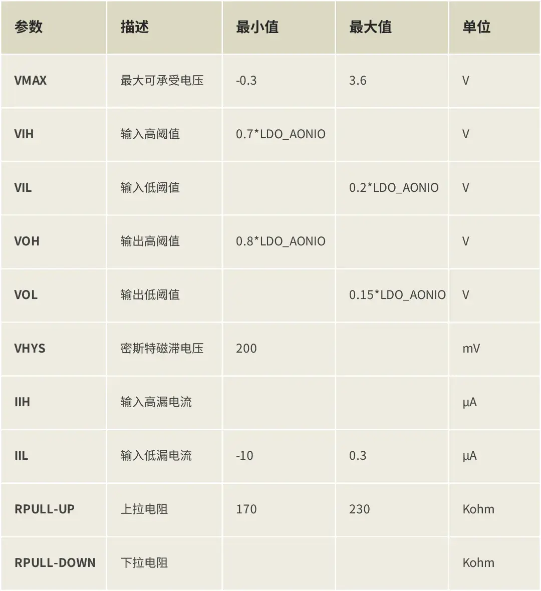 这类管脚电源域为长保持的LDO_AONIO电源(为内部电源,模组外部不可测量),这类电源在模组低功耗模式/PSM+下,仍然能够保持供电,因此AGPIO管脚在休眠状态下能够保持电平。