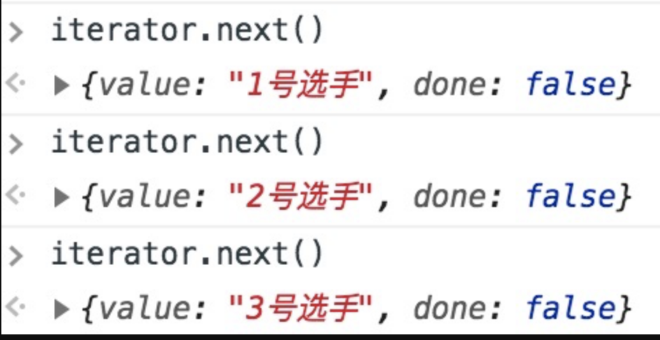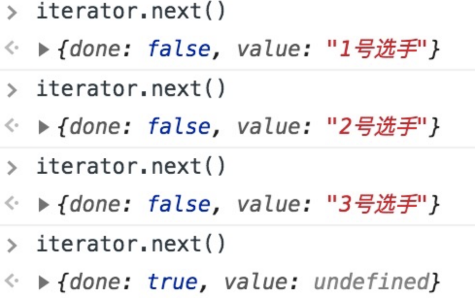 var iterator = iteratorGenerator(['1号选手', '2号选手', '3号选手'])