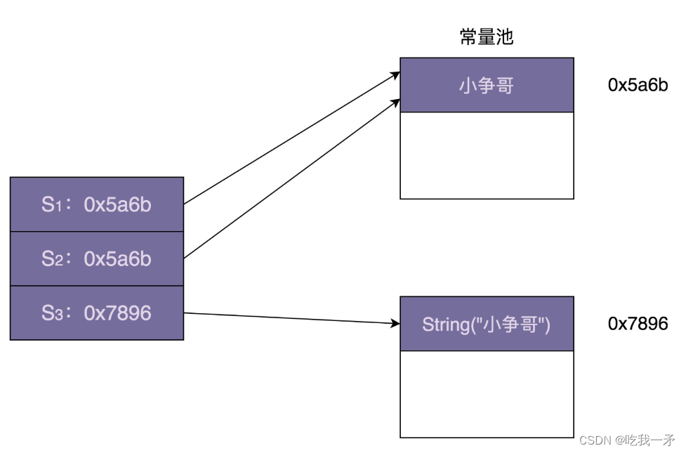 上面代码的运行结果是:一个true,一个false。跟Integer类的设计思路相似,String类利用享元模式来复用相同的字符串常量(也就是代码中的“小争哥”)。JVM会专门开辟一块存储区来存储字符串常量,这块存储区叫作“字符串常量池”。上面代码对应的内存存储结构如下所示: