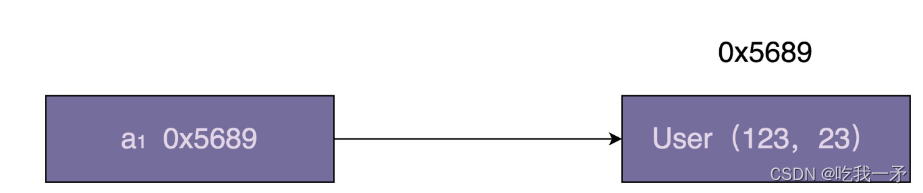 针对这条语句,我画了一张内存存储结构图,如下所示。a存储的值是User对象的内存地址,在图中就表现为a指向User对象。