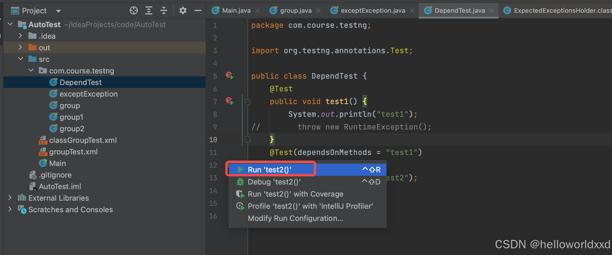 用到@Test注解的dependsOnMethods属性,格式@Test(dependsOnMethods = "测试方法名称")