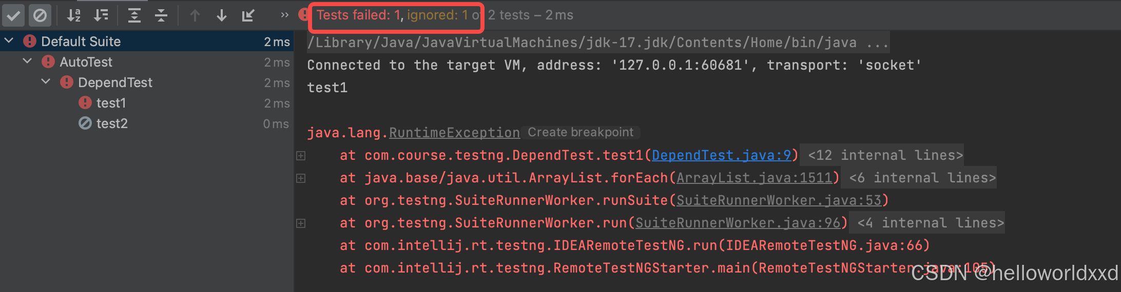 运行test2方法,执行结果如下:test1执行失败、test2被忽略不执行