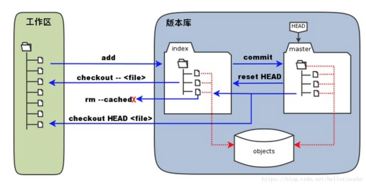 图中的 objects 标识的区域为 Git 的对象库,实际位于 ".git/objects" 目录下,里面包含了创建的各种对象及内容。