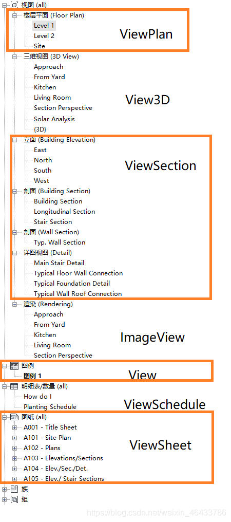 所有的视图都是继承自 Autodesk.Revit.DB.View,分别对应各种视图类型