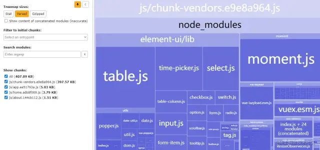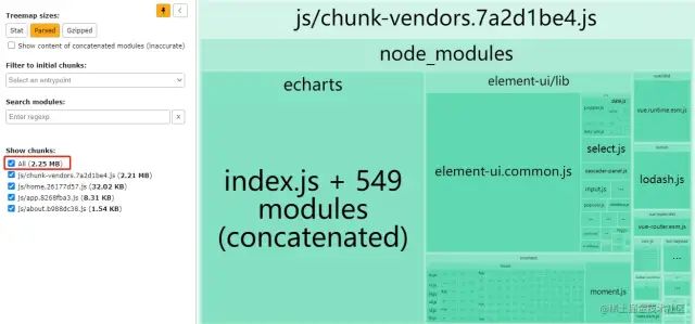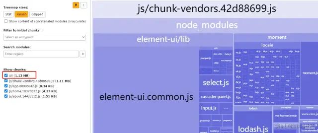 从上面的打包分析页面中可以看到,chunk-vendors.js 体积为 2.21M,其中最大的几个文件都是一些公共依赖包,那么只要把这些依赖提取出来,就可以解决 chunk-vendors.js 过大的问题