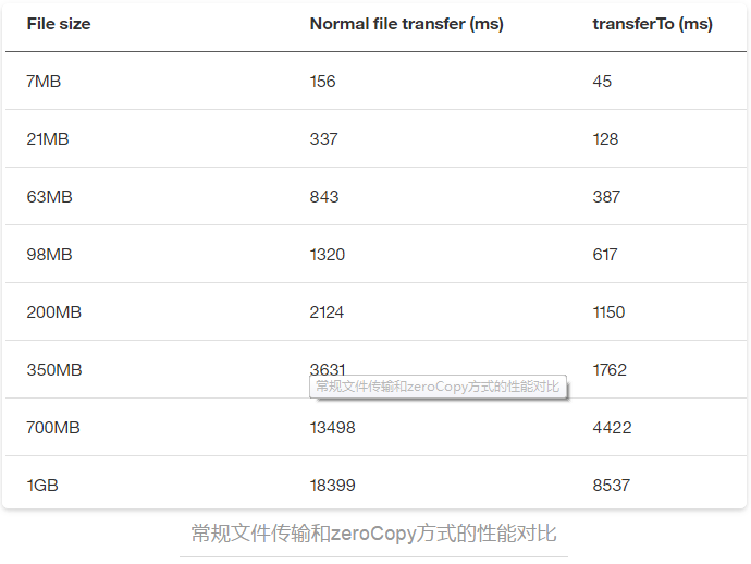 这里有四次拷贝,两次系统调用,这是非常低效的做法。如果使用sendfile,只需要一次拷贝就行:允许操作系统将数据直接从页缓存发送到网络上。所以在这个优化的路径中,只有最后一步将数据拷贝到网卡缓存中是需要的。