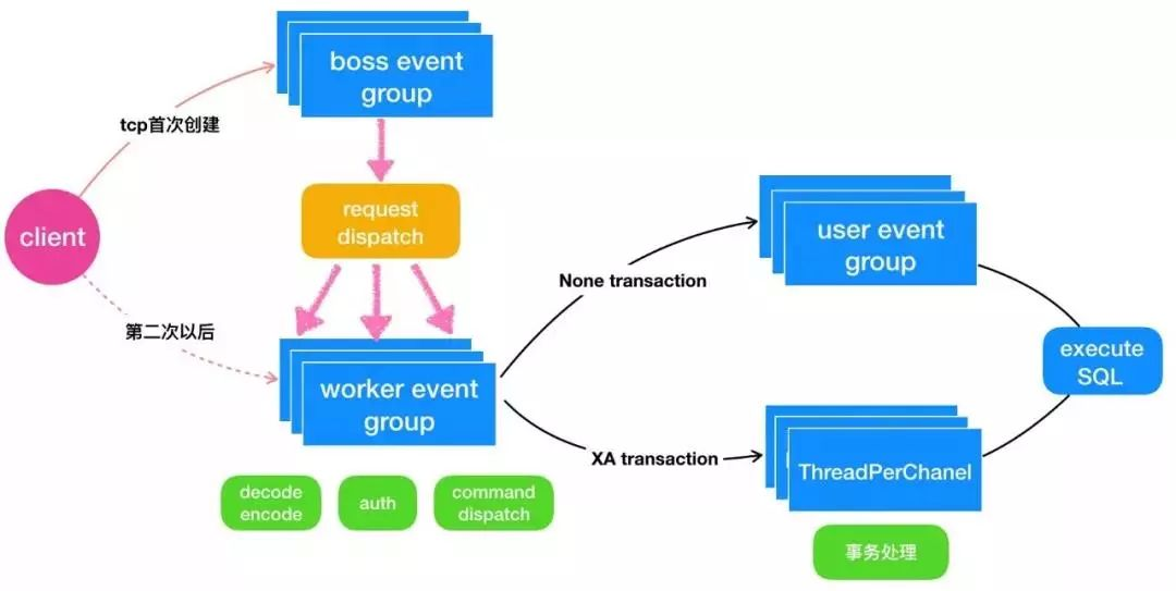 Sharding-Proxy是基于netty开发的数据库中间代理层,实现了标准的MySQL协议,可以看做是一个实现了数据分片的数据库。Sharding-Proxy已经实现了基于Atomikos的XA事务,为了保证所有的子事务都处于同一个线程之中,整个Proxy的线程模型进行了如下的调整: