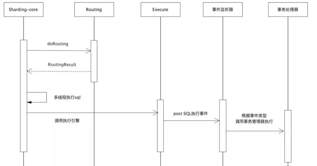 从图可以看出在Sharding-core在调用执行引擎时,会根据SQL的种类产生事件进行分发。事务监听线程在收到符合要求的事件后,再调用对应的事务处理器进行处理。