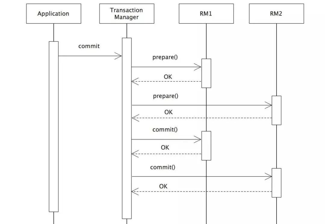 二阶段提交是XA的标准实现。它将分布式事务的提交拆分为2个阶段:prepare和commit/rollback。