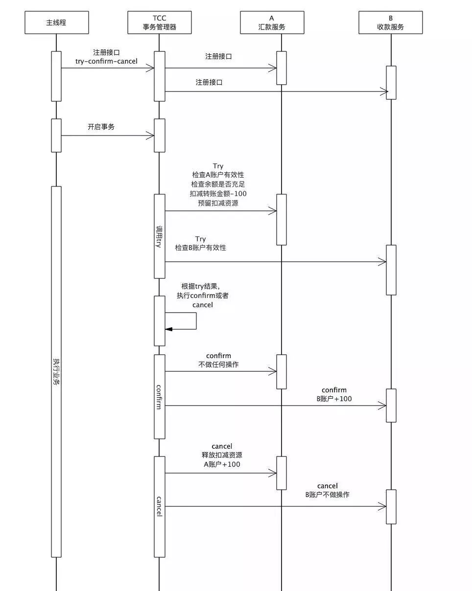 汇款服务和收款服务分别需要实现,Try-Confirm-Cancel接口,并在业务初始化阶段将其注入到TCC事务管理器中。