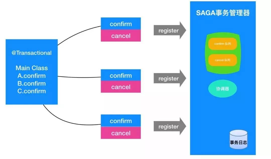 Saga模型把一个分布式事务拆分为多个本地事务,每个本地事务都有相应的执行模块和补偿模块( TCC中的Confirm和Cancel)。当Saga事务中任意一个本地事务出错时,可以通过调用相关的补偿方法恢复之前的事务,达到事务最终的一致性。