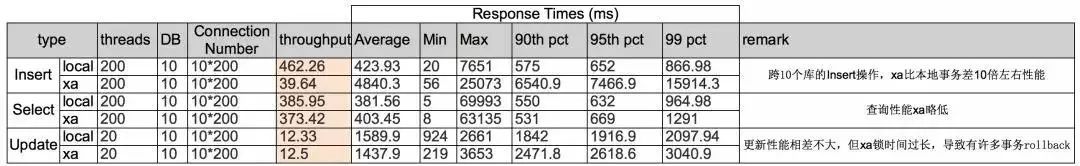 压测结果表明:XA事务的插入和更新的性能,基本上同跨库的个数呈线性关系,查询的性能基本不受影响,建议在并发量不大,每次事务涉及的库在10个以内时,可以使用XA。