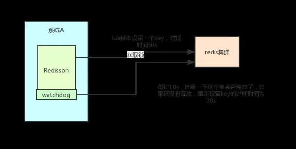 - Redisson 中有一个 Watchdog 的概念,翻译过来就是看门狗,它会在你获取锁之后,每隔 10s 帮你把 Key 的超时时间设为 30s。