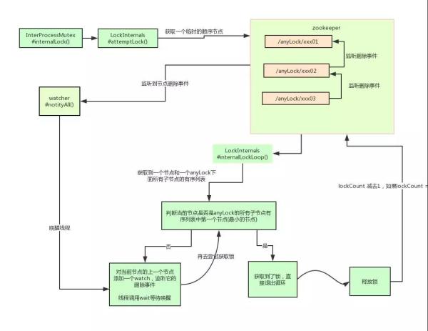 其实 Curator 实现分布式锁的底层原理和上面分析的是差不多的。这里我们用一张图详细描述其原理: