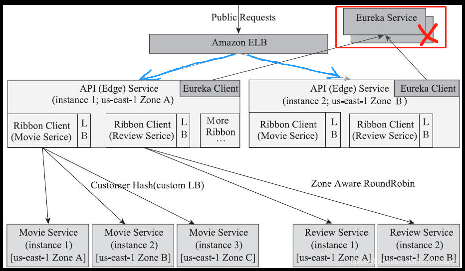 从上图可以看出,如果EurekaSerivce被去掉(红色X),ELB直连后端的API Service(蓝色箭头),这个架构仍然也是可以工作的。