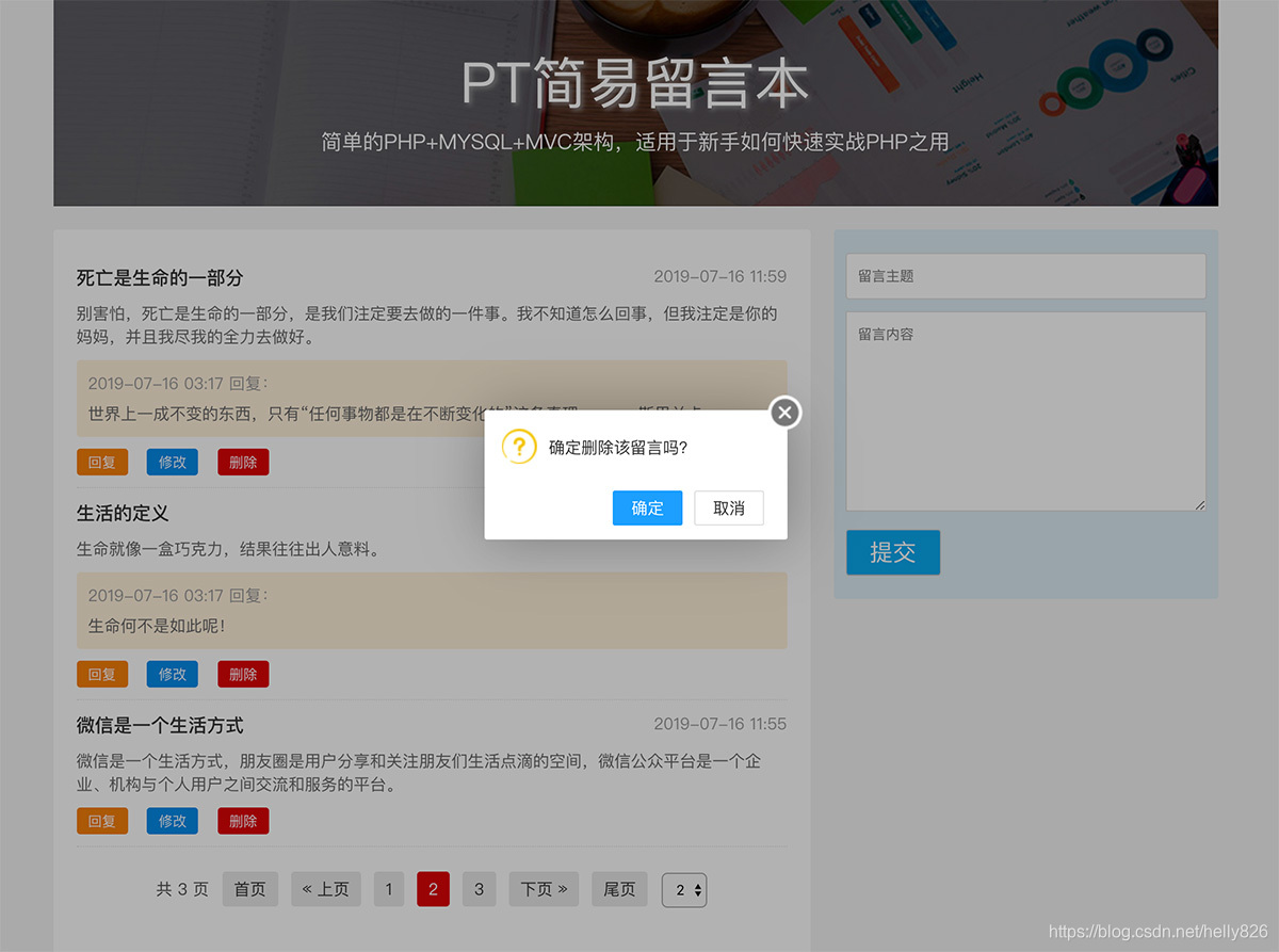 架构:PHP+MYSQL+Layui+smarty,实现简单的MVC构架,一个页面完成留言本的增、删、改、回复等功能。