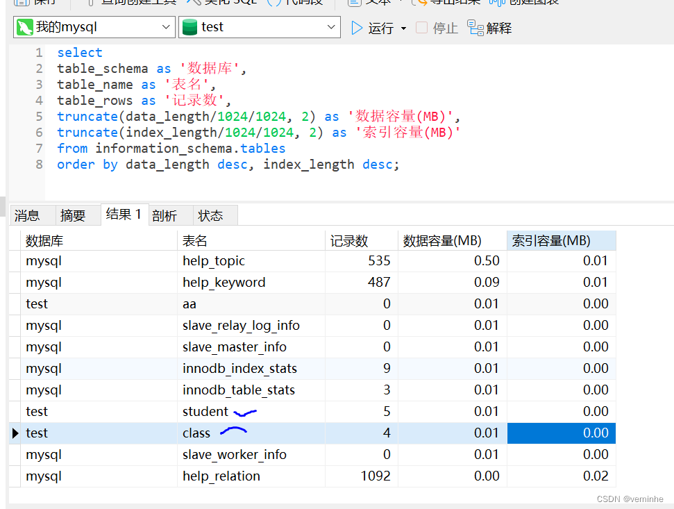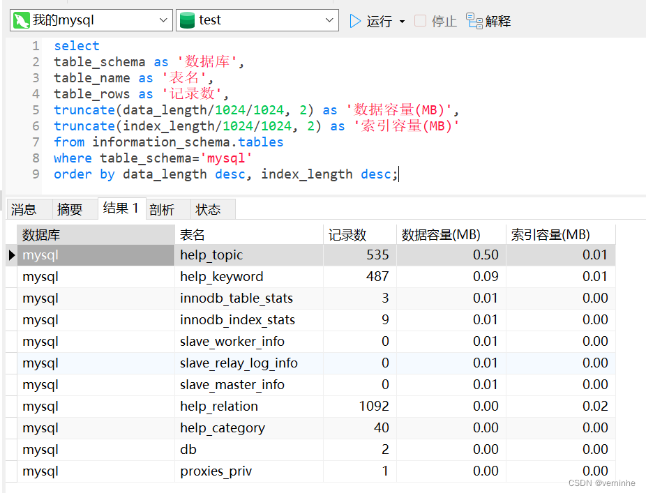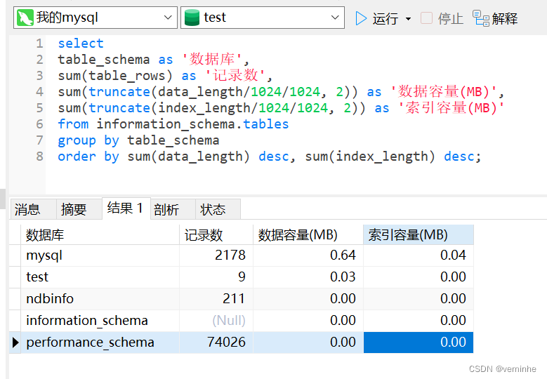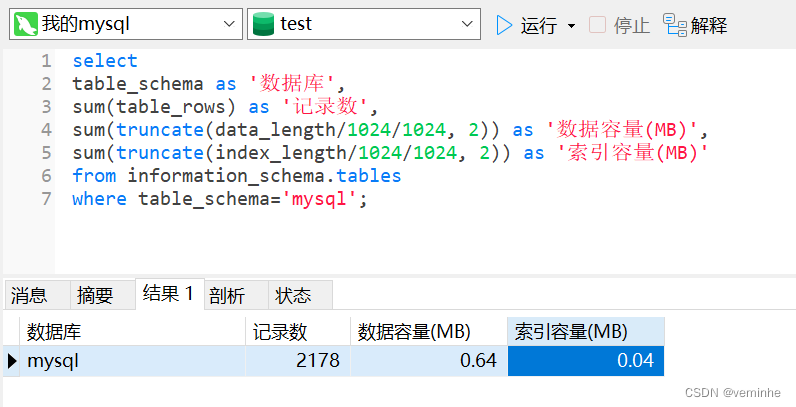 sum(truncate(index_length/1024/1024, 2)) as '索引容量(MB)'