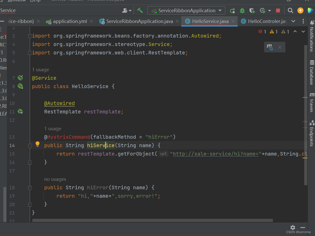 改造HelloService类,在hiService方法上加上@HystrixCommand注解。该注解对该方法创建了熔断器的功能,并指定了fallbackMethod熔断方法,熔断方法直接返回了一个字符串,字符串为"hi,"+name+",sorry,error!",代码如下: