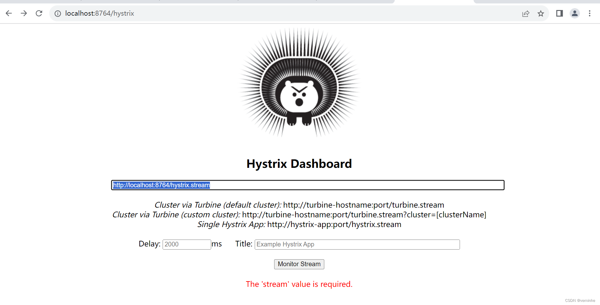 打开浏览器:访问http://localhost:8764/hystrix,界面如下: