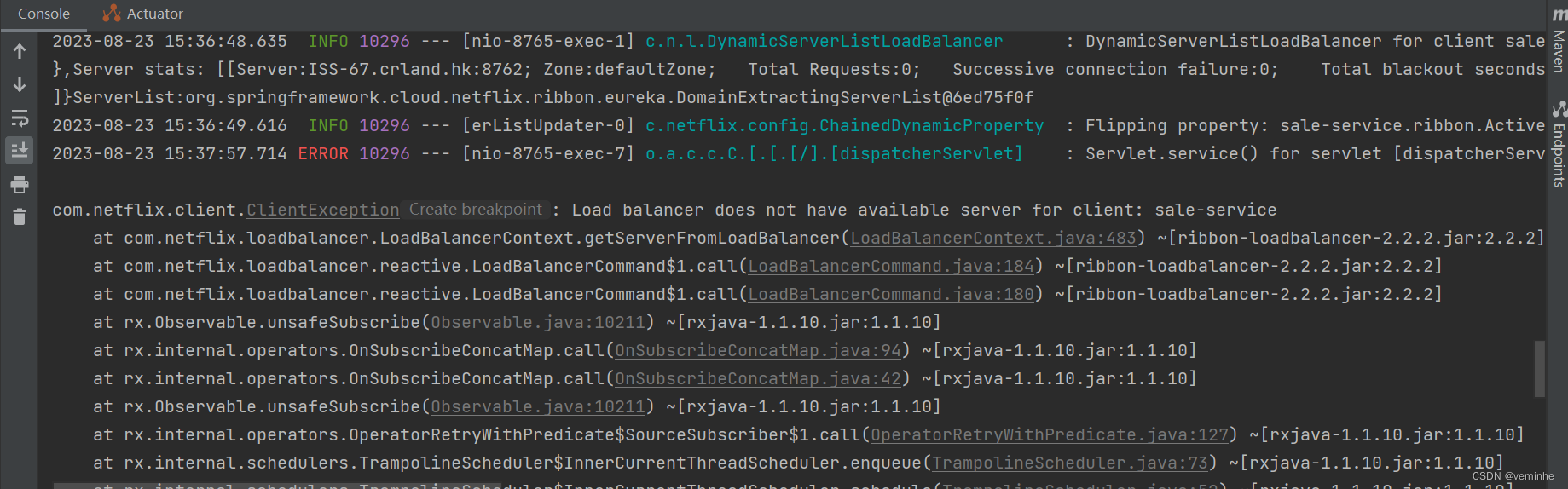 这就说明当 sale-service 工程不可用的时候,service-ribbon调用 sale-service的API接口时,会执行快速失败,直接返回一组字符串,而不是等待响应超时,这很好的控制了容器的线程阻塞。