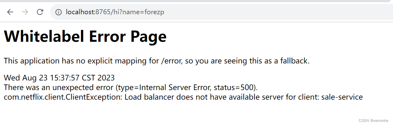 此时关闭 sale-service 8763工程,当我们再访问http://localhost:8764/invokeHi?name=forezp,浏览器会显示: