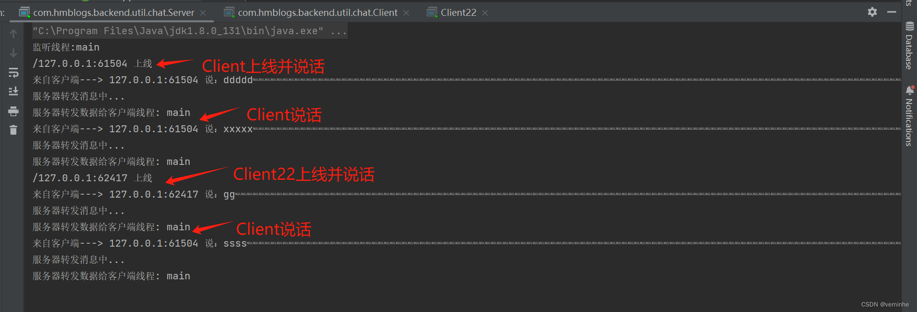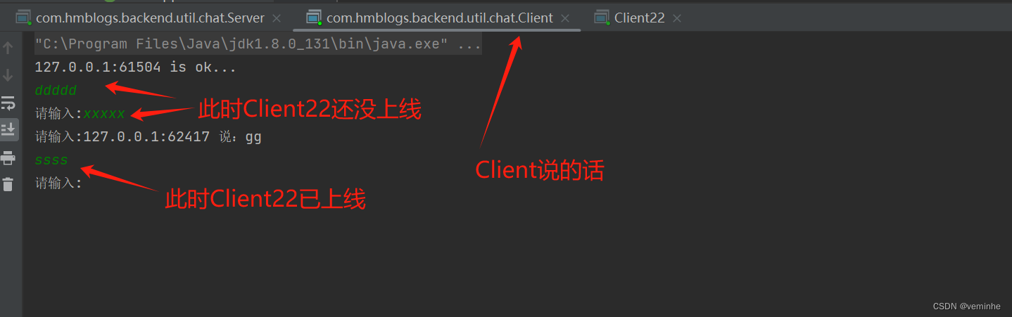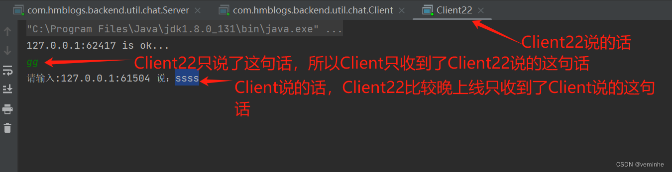 启动Server、Client、Client22后,在Client输入内容、在Client22输入内容后,对3个控制台截图如下