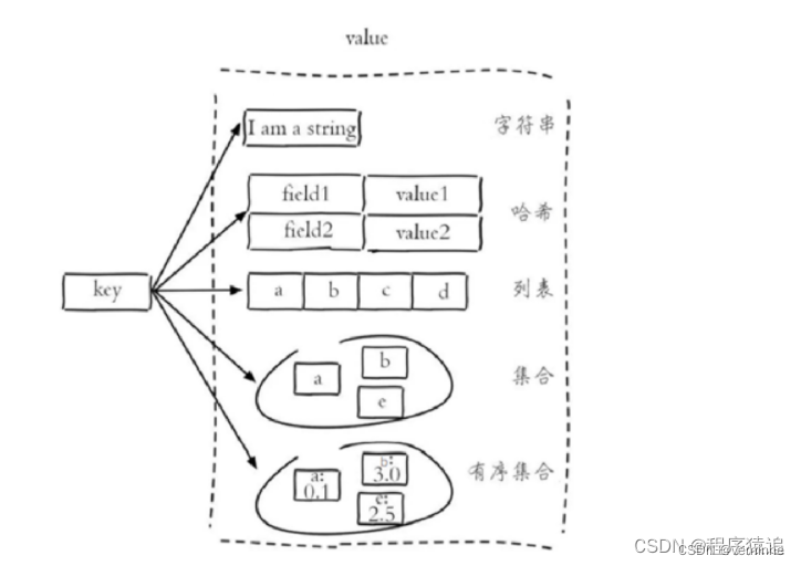 Redis存储的是key-value结构的数据,其中key是字符串类型,value有5种常用的数据类型:字符串 string、哈希 hash、列表 list、集合 set、有序集合 sorted set / zset。