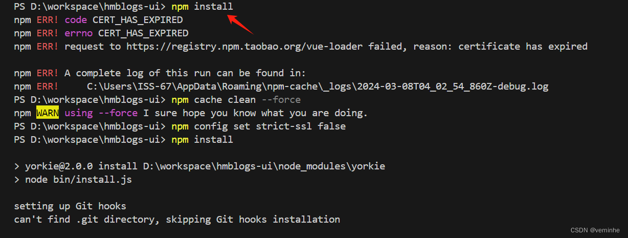 然后我自己打算从0到1搞到我自己的hmblogs-ui里,复制代码后,先写登录页面,把其它代码都去掉,然后做npm install的时候,报错了