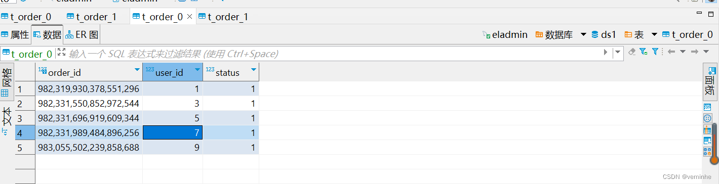 2024-04-05 16:59:33.562 INFO 24508 --- [nio-8080-exec-7] ShardingSphere-SQL : Actual SQL: ds1 ::: insert into t_order_0 (status, user_id, order_id) values (?, ?, ?) ::: [1, 9, 983052471892967424]