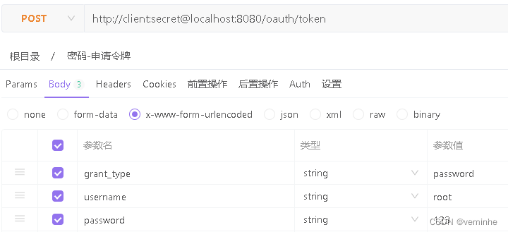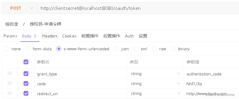 申请令牌的请求示例(地址栏中的client表示client_id,secret表示密钥值):