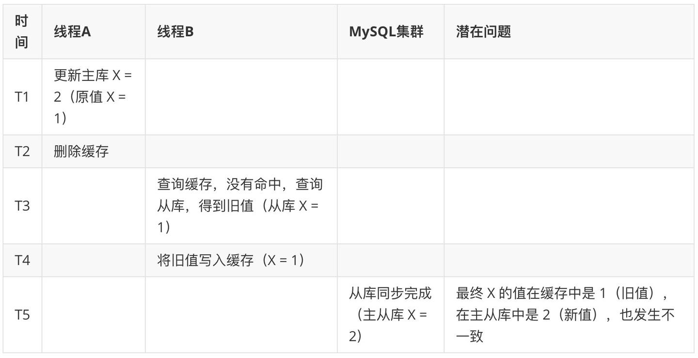 或者,在”先更新数据库,再删除缓存”方案下,“读写分离 + 主从库延迟”也会导致不一致: