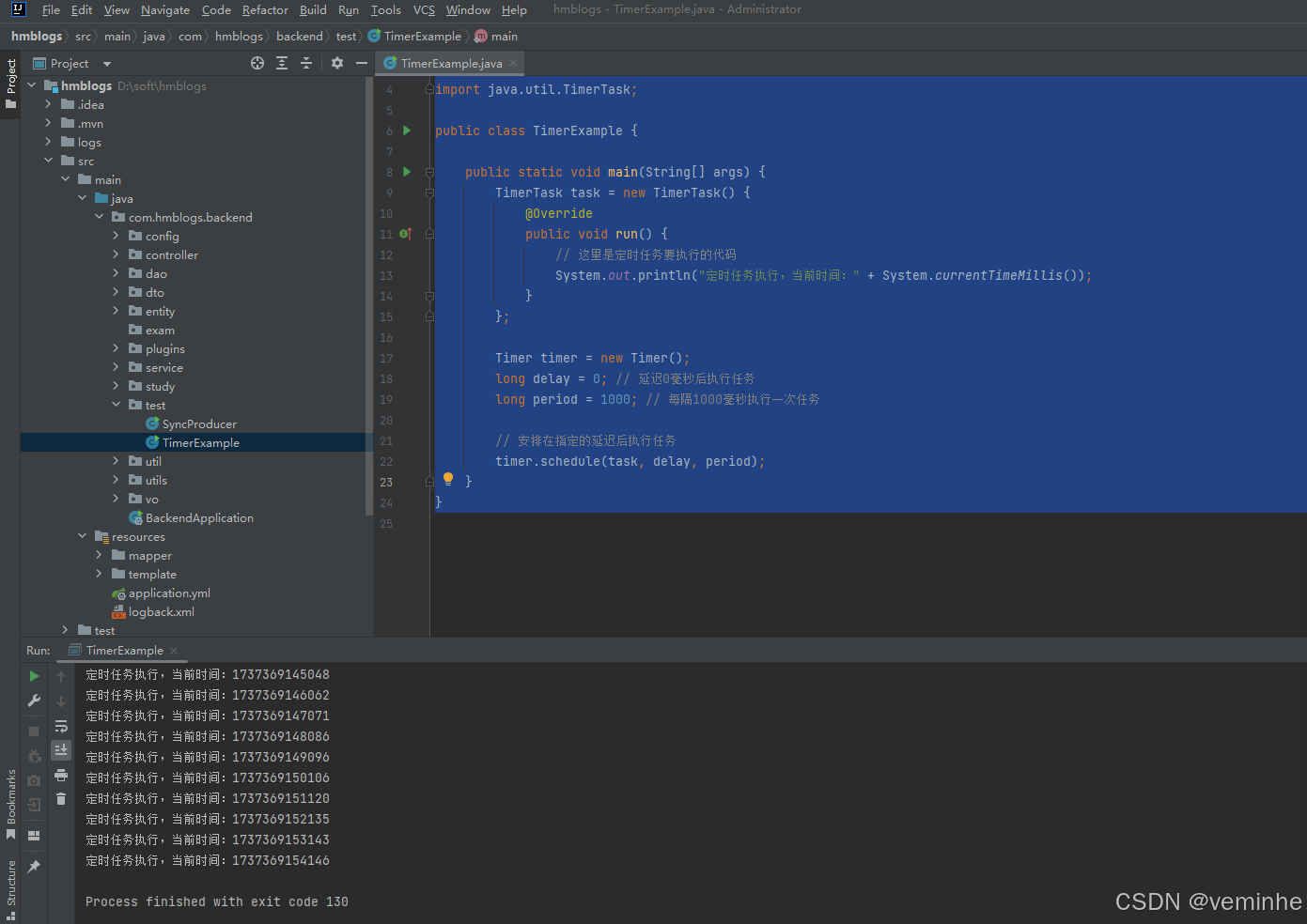 这段代码会创建一个定时任务,该任务会在启动后每隔1000毫秒打印当前的时间戳。你可以通过修改delay和period的值来调整定时任务的启动时间和执行间隔。