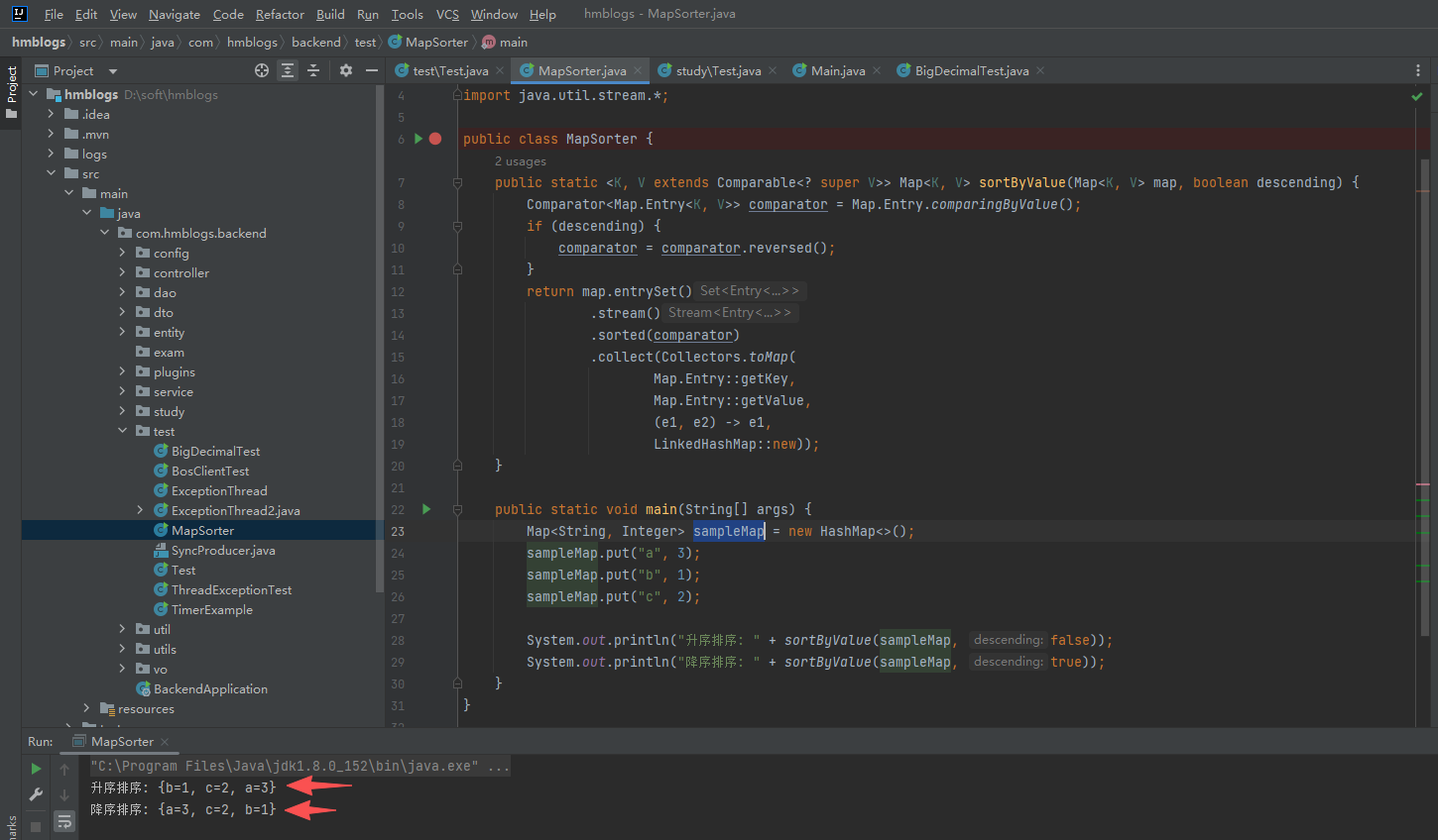 System.out.println("升序排序: " + sortByValue(sampleMap, false));
