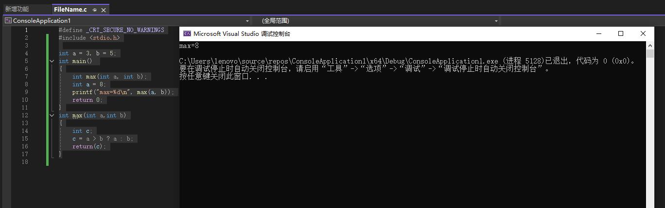 8、在同一个源文件中,全局变量与局部变量同名,这时会出现什么情况呢?请考虑是按哪一种情况处理:(1)出错;(2)局部变量无效,全局变量有效;(3)在局部变量的作用范围内,局部变量有效,全局变量被“屏蔽”,即它不起作用。请先分析下面的程序。